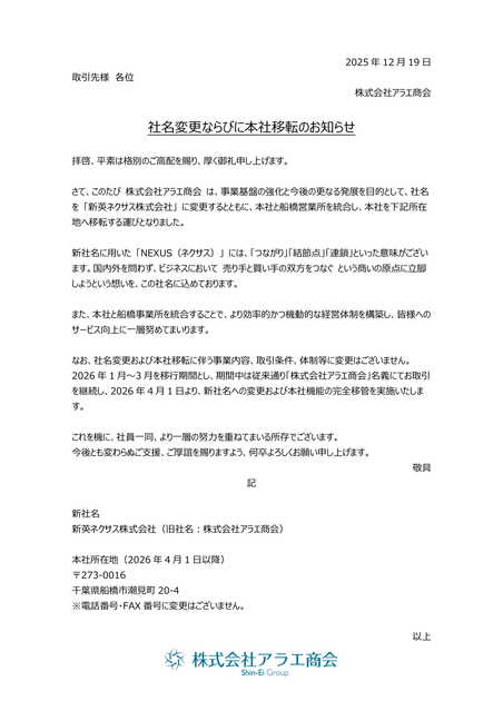 社名変更及び本社移転のお知らせ(株式会社アラエ商会)